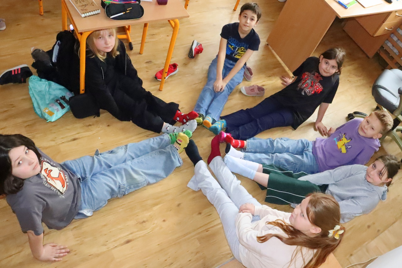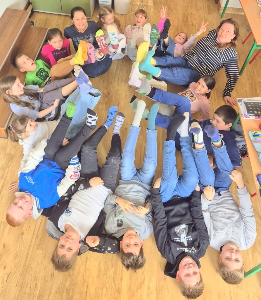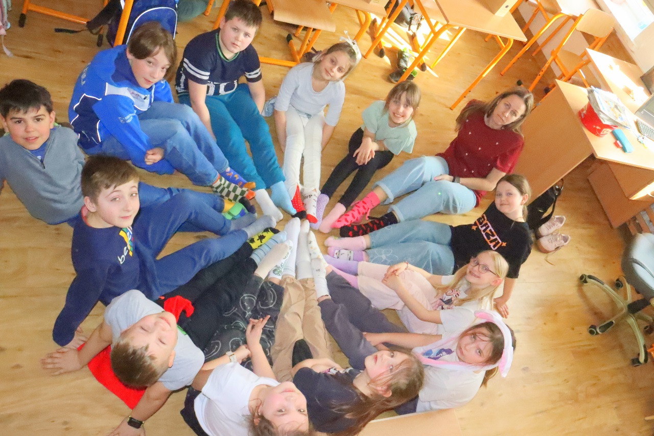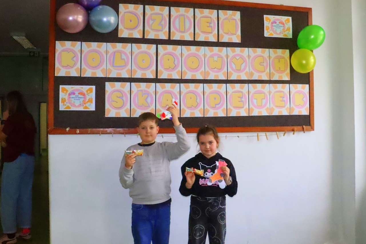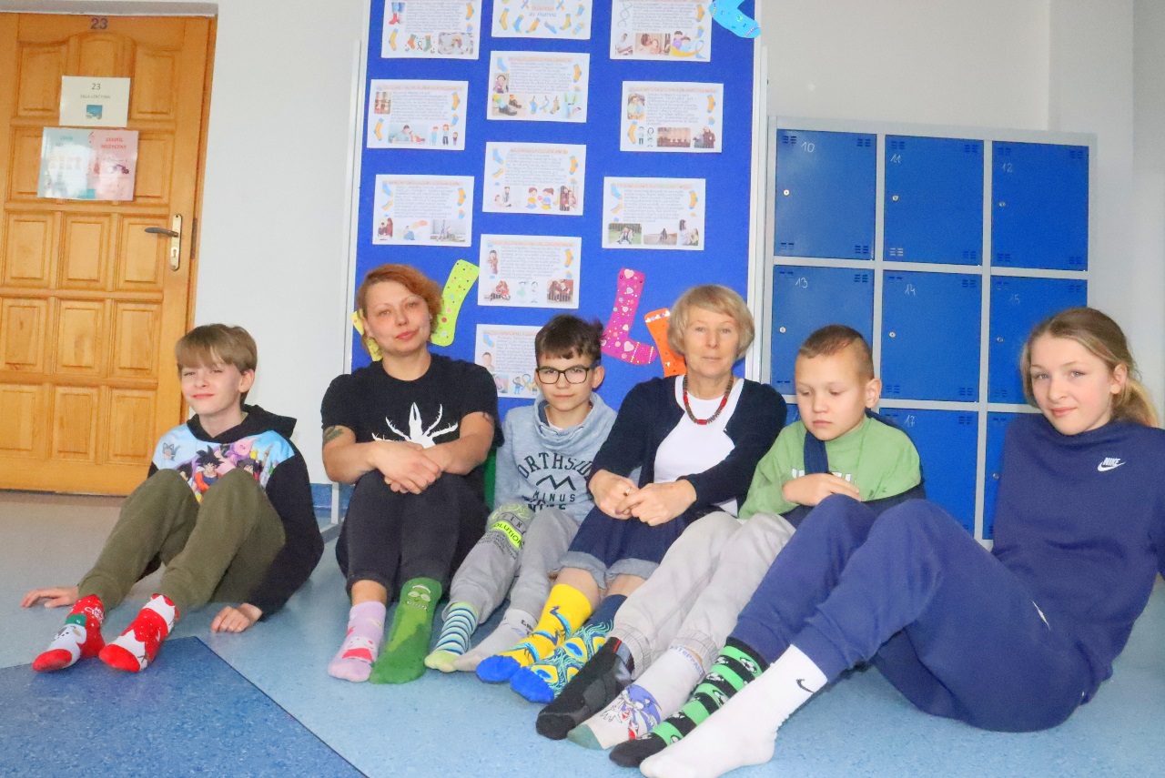 Uczniowie i nauczyciele z klas 1-3 założyli dziś kolorowe skarpetki nie do pary i spotkali się na korytarzu szkolnym, aby zwiększyć świadomość uczniów na temat osób dotkniętych tą wadą genetyczną.