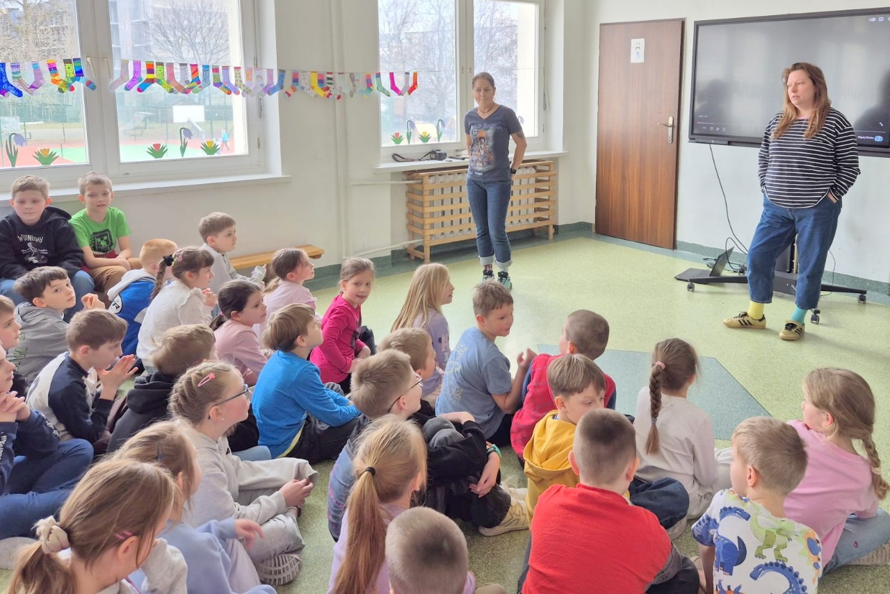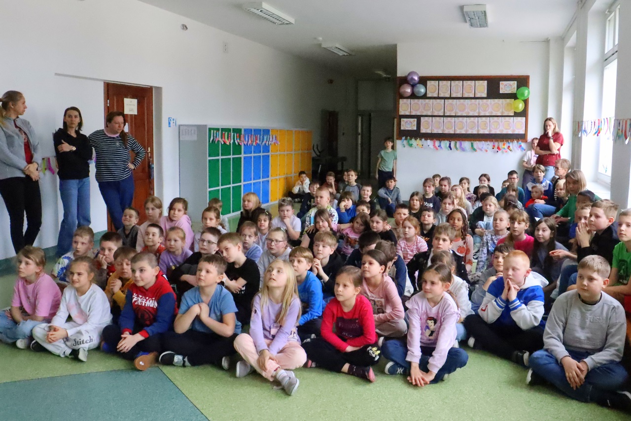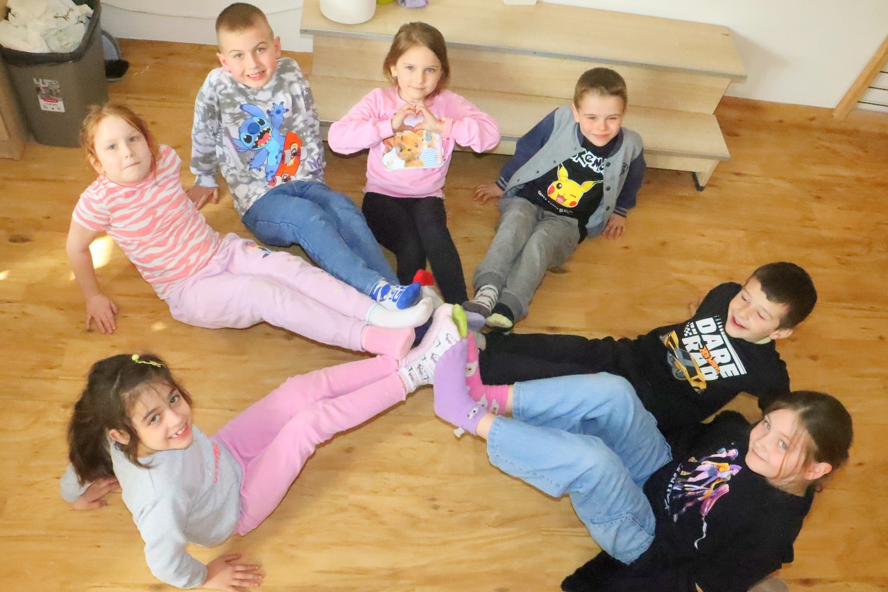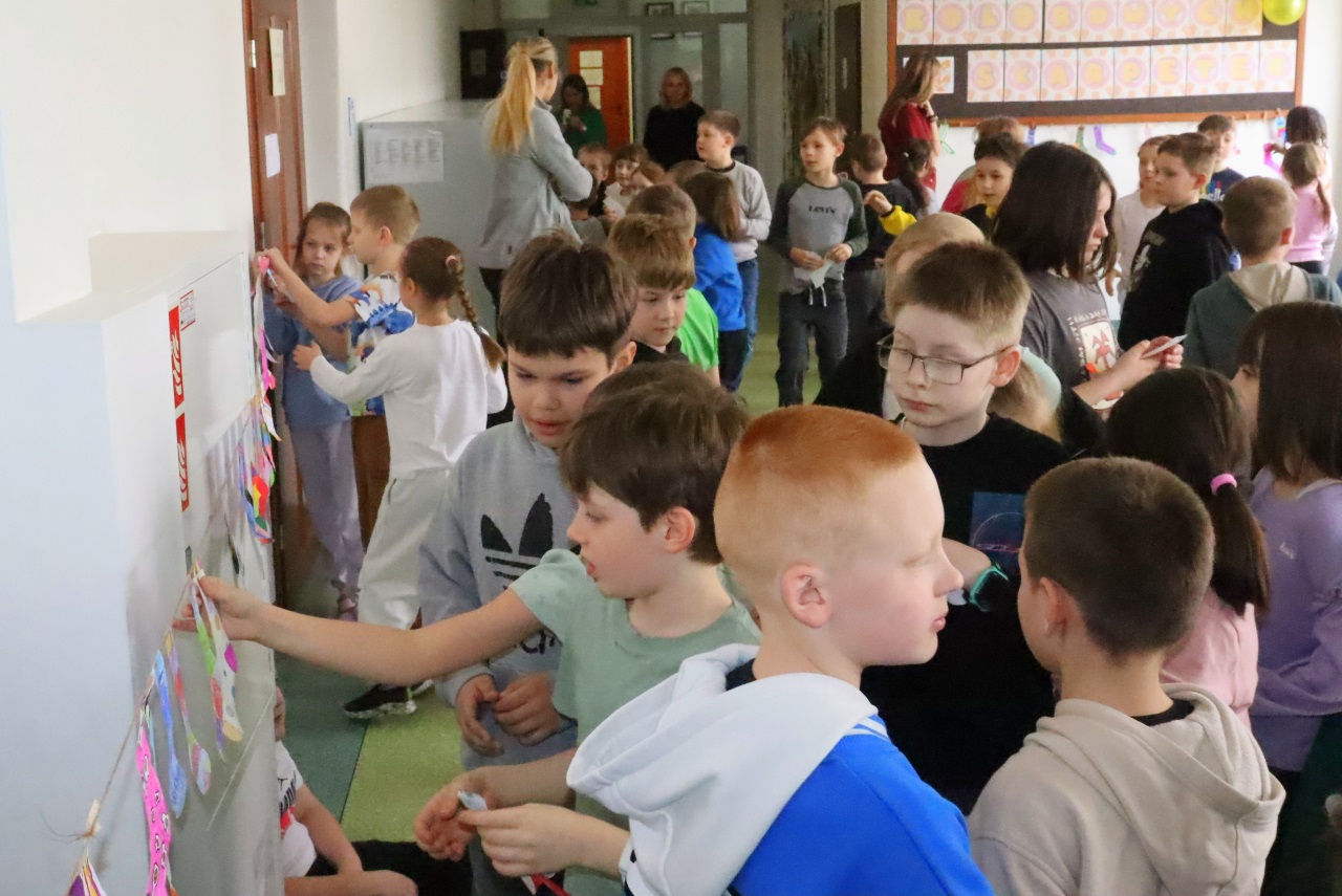Uczniowie i nauczyciele z klas 1-3 założyli dziś kolorowe skarpetki nie do pary i spotkali się na korytarzu szkolnym, aby zwiększyć świadomość uczniów na temat osób dotkniętych tą wadą genetyczną.